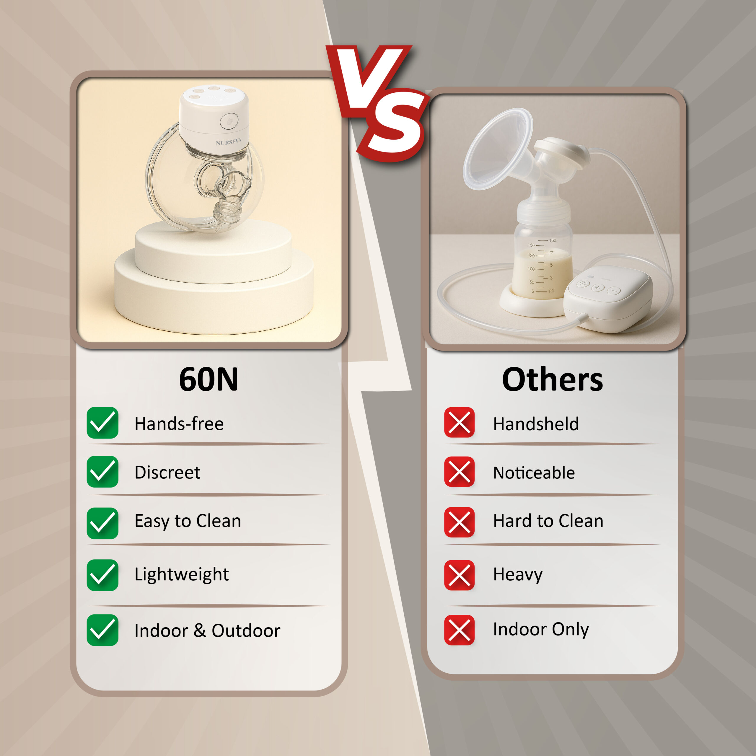 DuoCare 60N offers a fully hands-free, lightweight, and discreet pumping experience, making it easy to use both at home and on the go. With fewer parts to clean and a low-noise design, it keeps your routine simple and comfortable. Traditional pumps are handheld, bulky, and noticeable, with multiple parts that make cleaning harder. They limit mobility and are typically practical only for indoor use.
